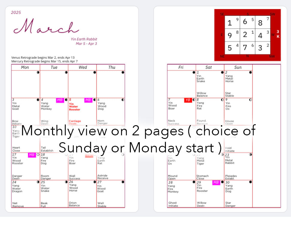 Each monthly, weekly and daily view will have the Chinese astrological element and animal listed ( otherwise known as Heavenly Stem and Earthly Branches ), as well as the 12 Day Officers and 28 Constellations to help you choose what dates to use and what dates to avoid.